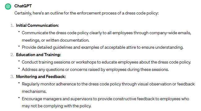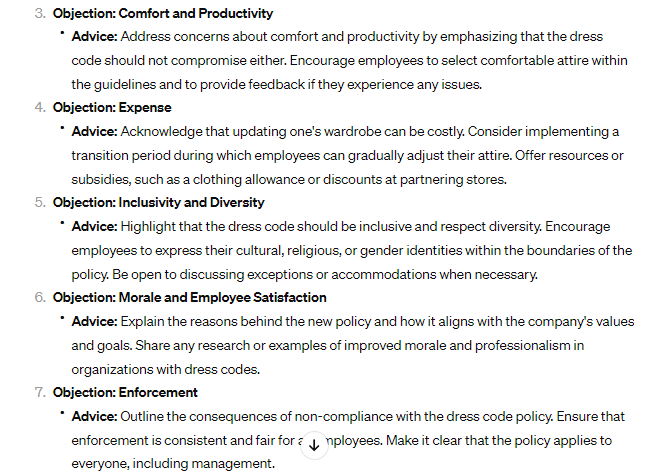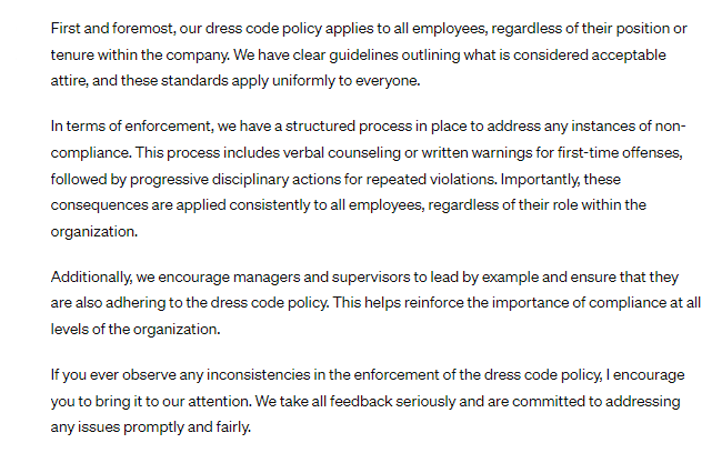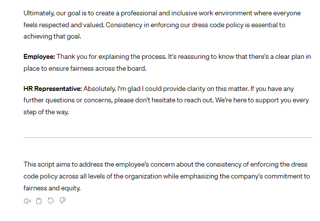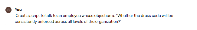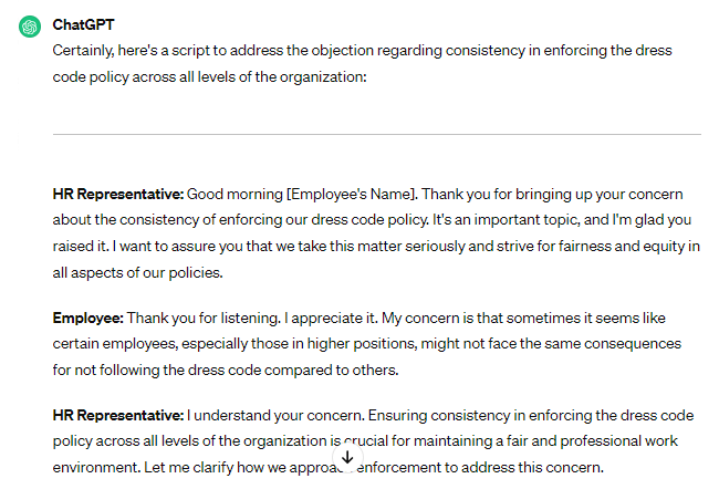 Creat a script to talk to an employee whose objection is "Whether the dress code will be consistently enforced across all levels of the organization?"